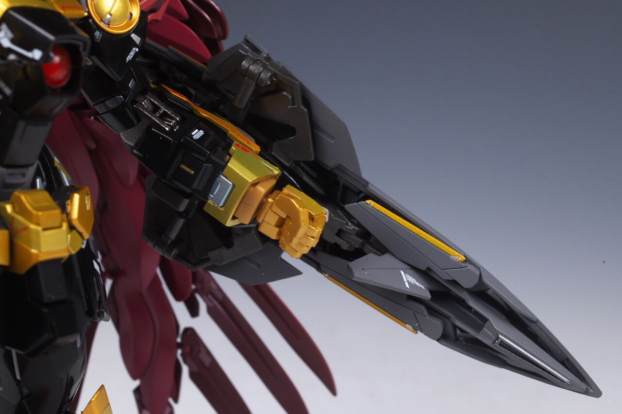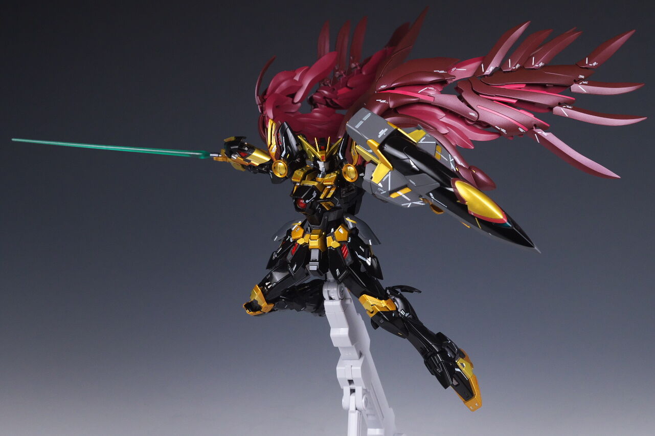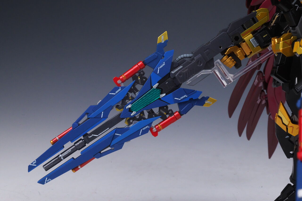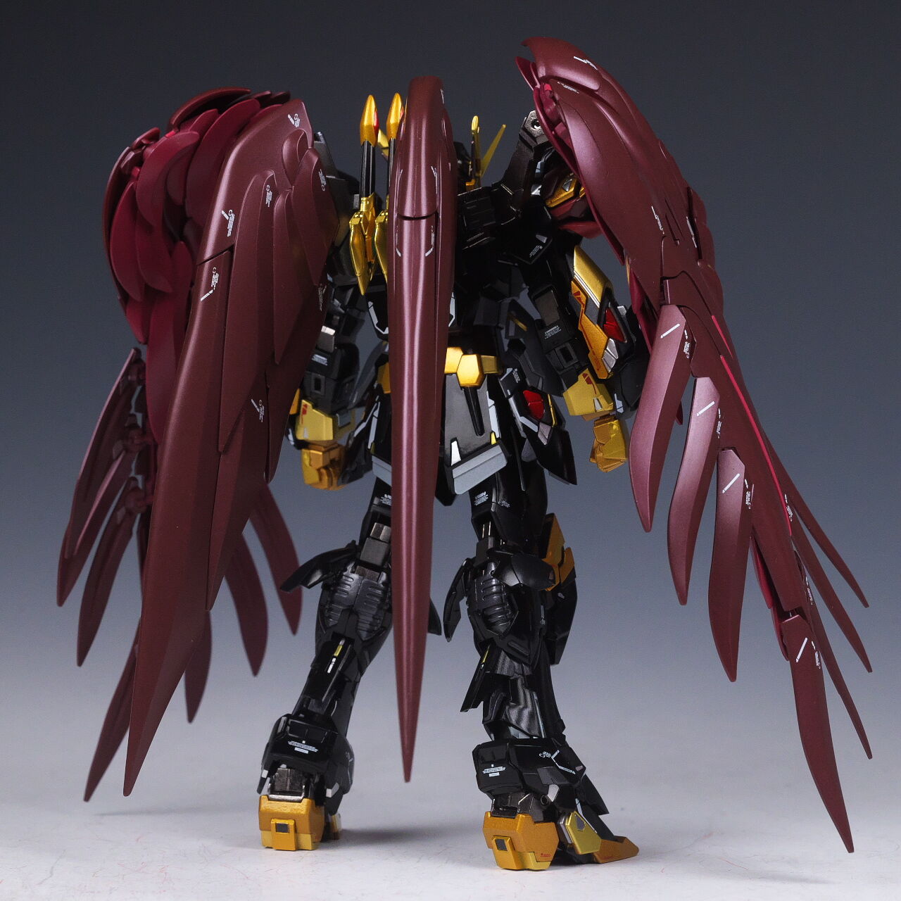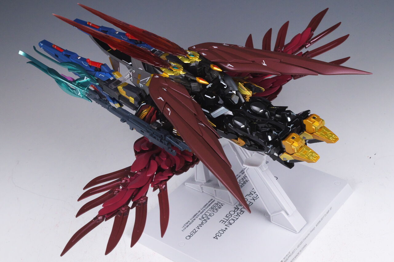 本体造形はノーマルのウイングゼロEWと同じですが、ガウェインをイメージしたという黒金カラーは光沢の強い黒と2色の金で深みのある色と質感に仕上がっており、ゼロのマントイメージのワインレッドのウイングも独特な色味で存在感があり、複数の新武装も造形やギミックなどかなり凝った作りで面白く、想像していたよりも濃く満足度の高い内容になってました。