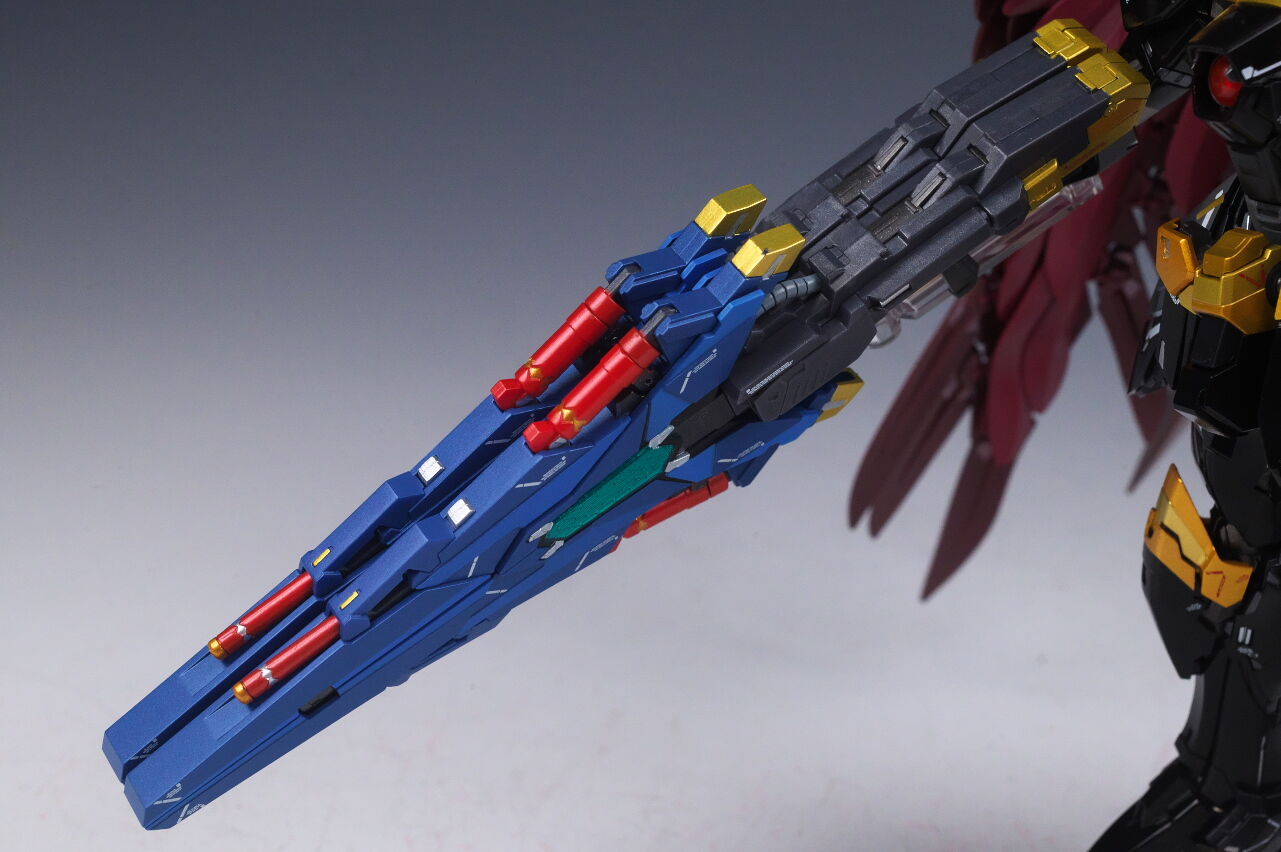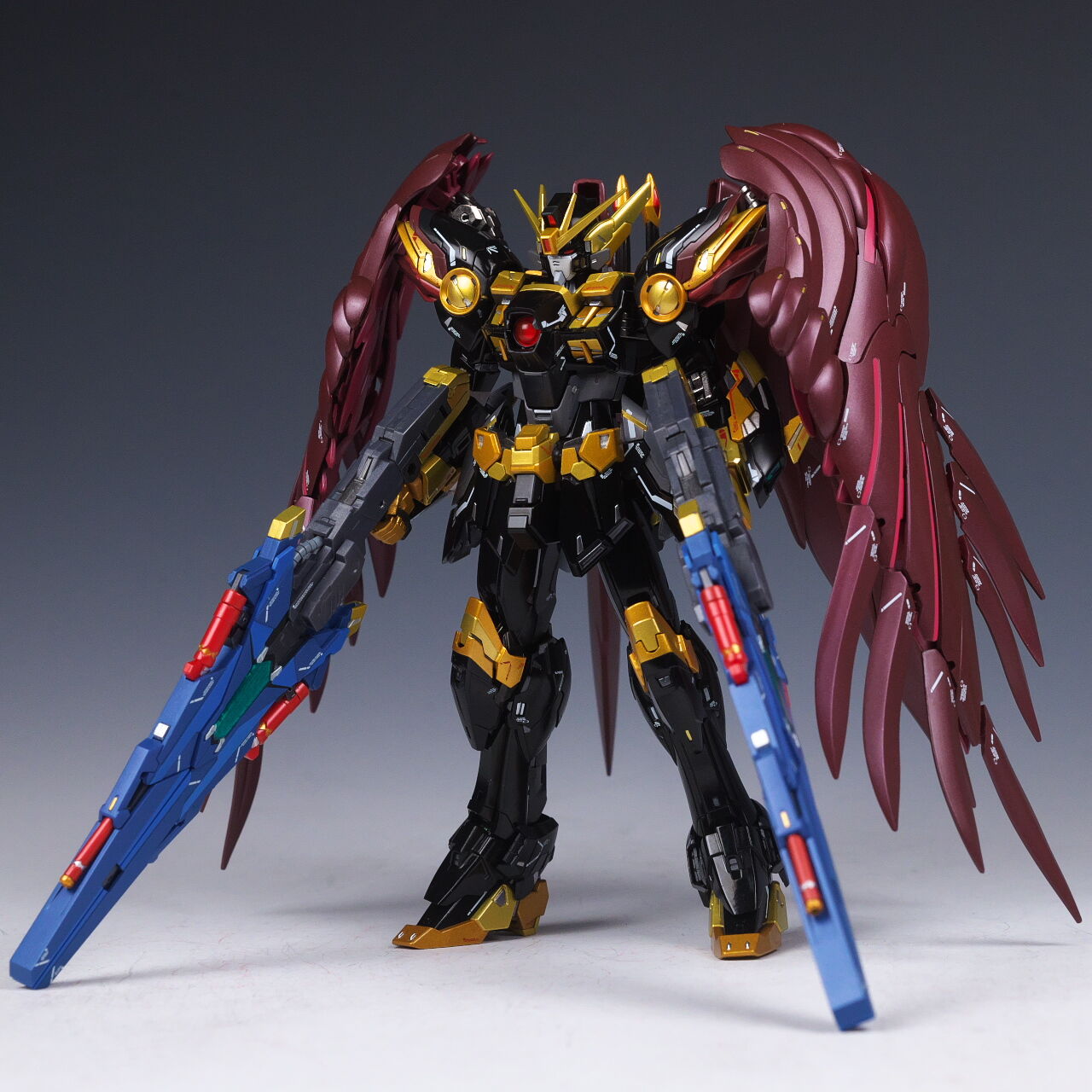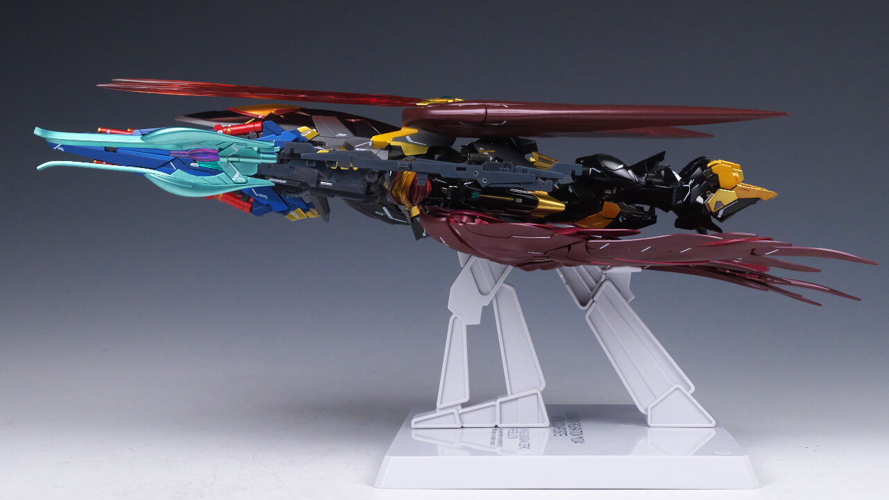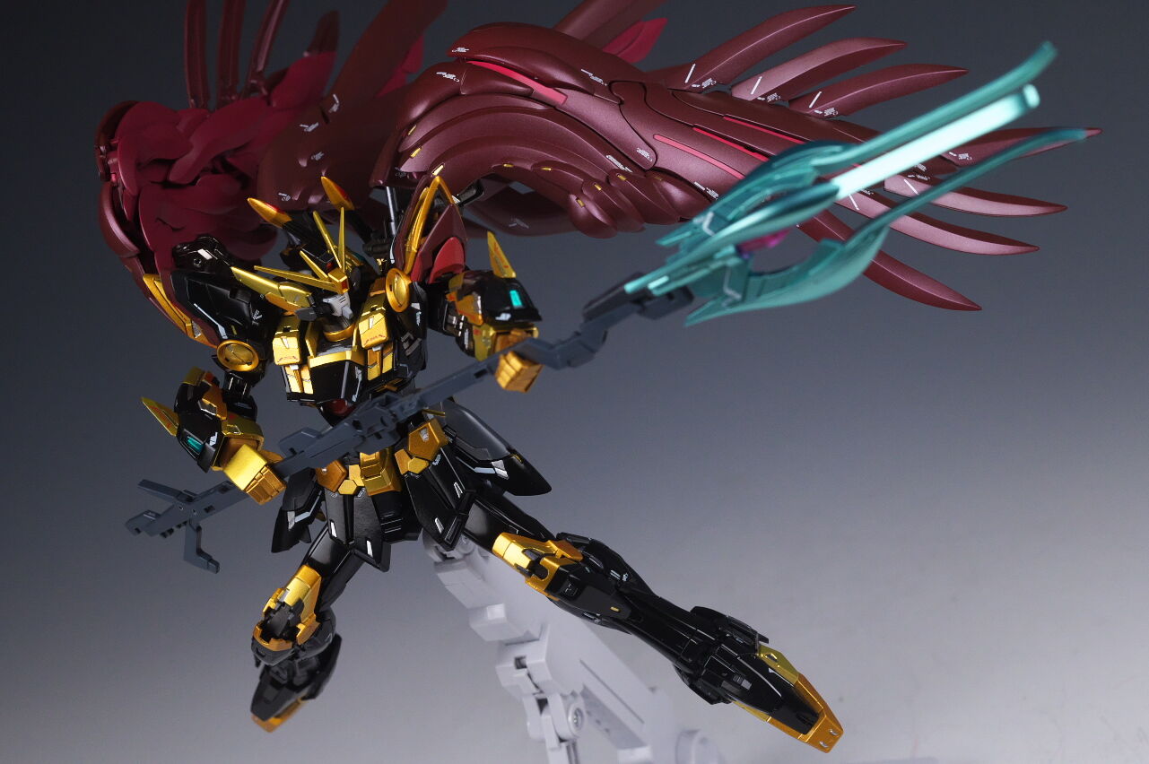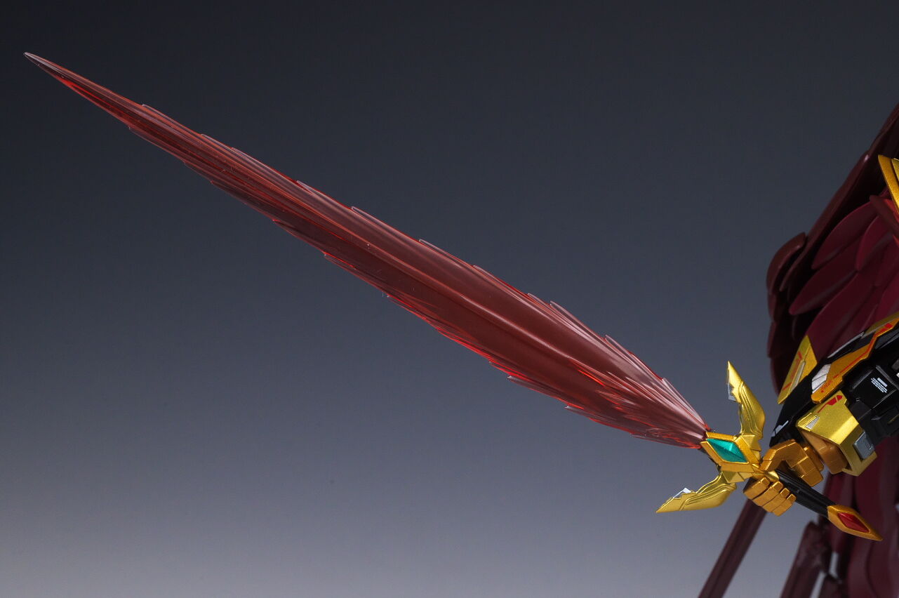 本体造形はノーマルのウイングゼロEWと同じですが、ガウェインをイメージしたという黒金カラーは光沢の強い黒と2色の金で深みのある色と質感に仕上がっており、ゼロのマントイメージのワインレッドのウイングも独特な色味で存在感があり、複数の新武装も造形やギミックなどかなり凝った作りで面白く、想像していたよりも濃く満足度の高い内容になってました。