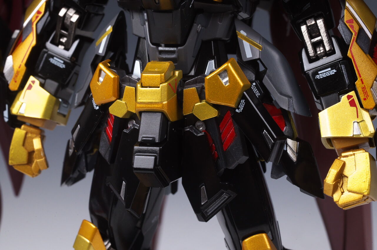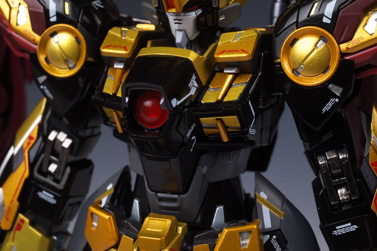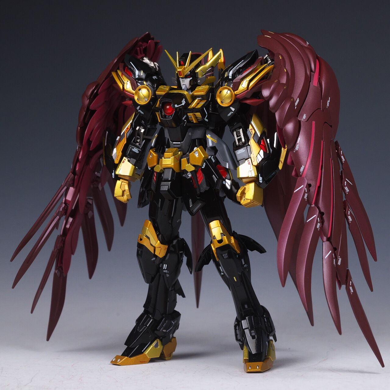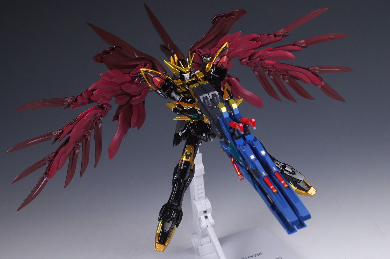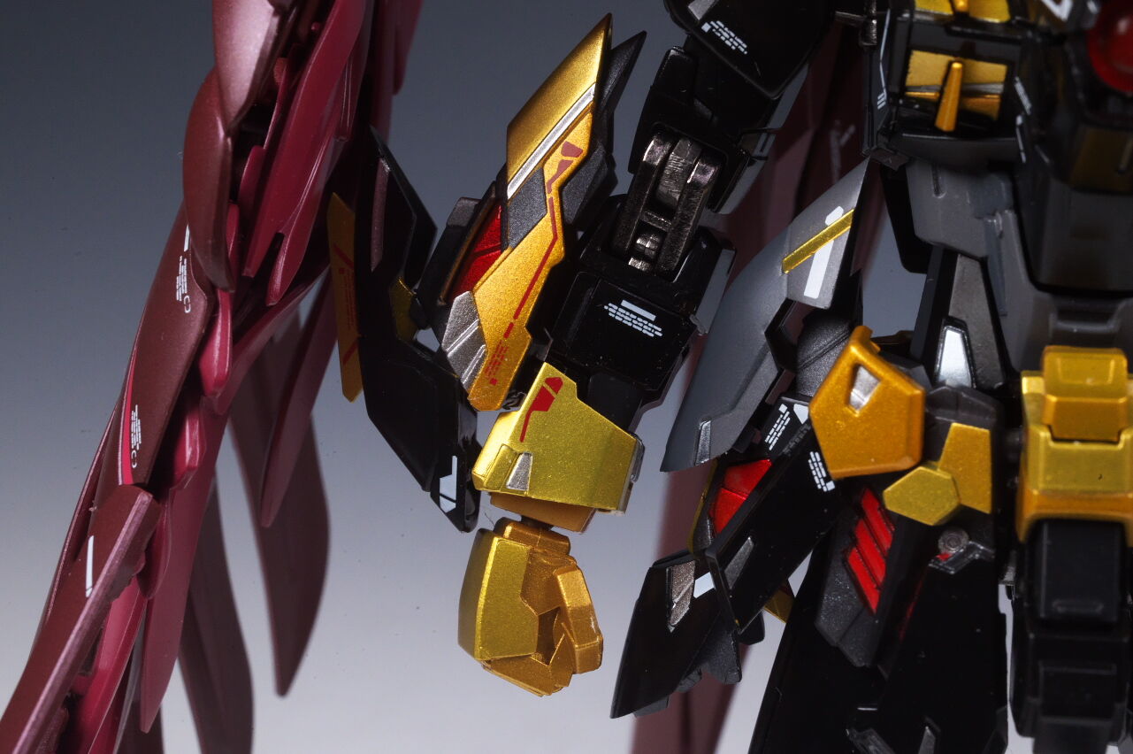 本体造形はノーマルのウイングゼロEWと同じですが、ガウェインをイメージしたという黒金カラーは光沢の強い黒と2色の金で深みのある色と質感に仕上がっており、ゼロのマントイメージのワインレッドのウイングも独特な色味で存在感があり、複数の新武装も造形やギミックなどかなり凝った作りで面白く、想像していたよりも濃く満足度の高い内容になってました。