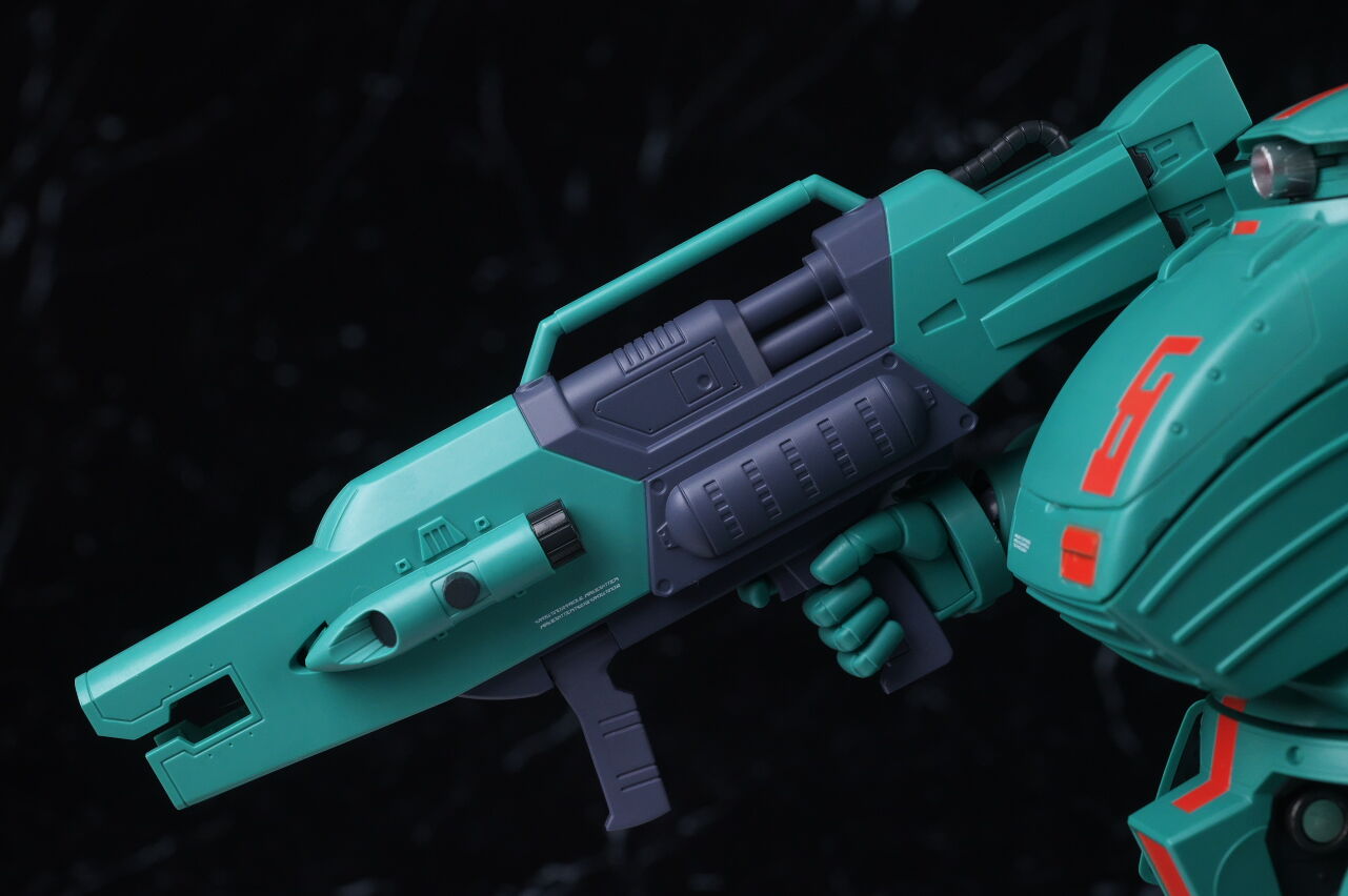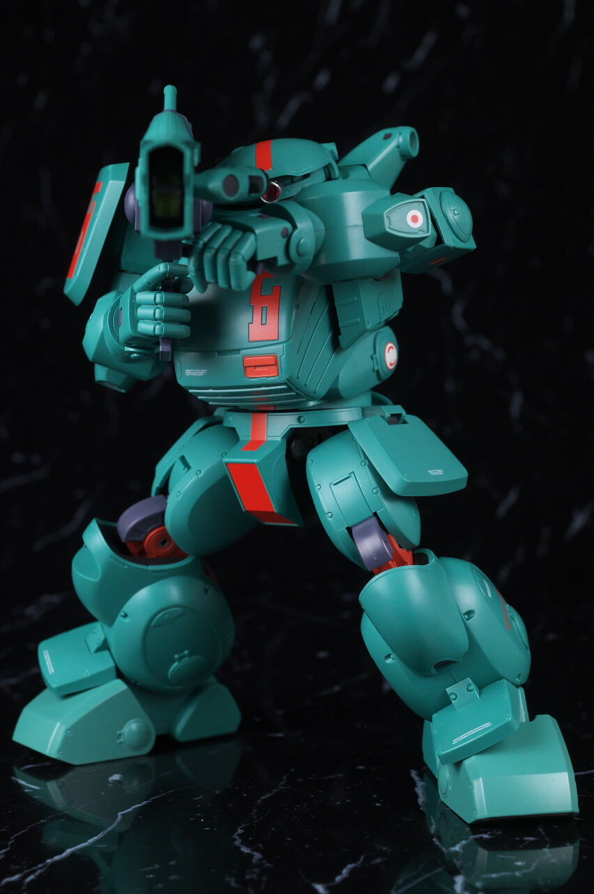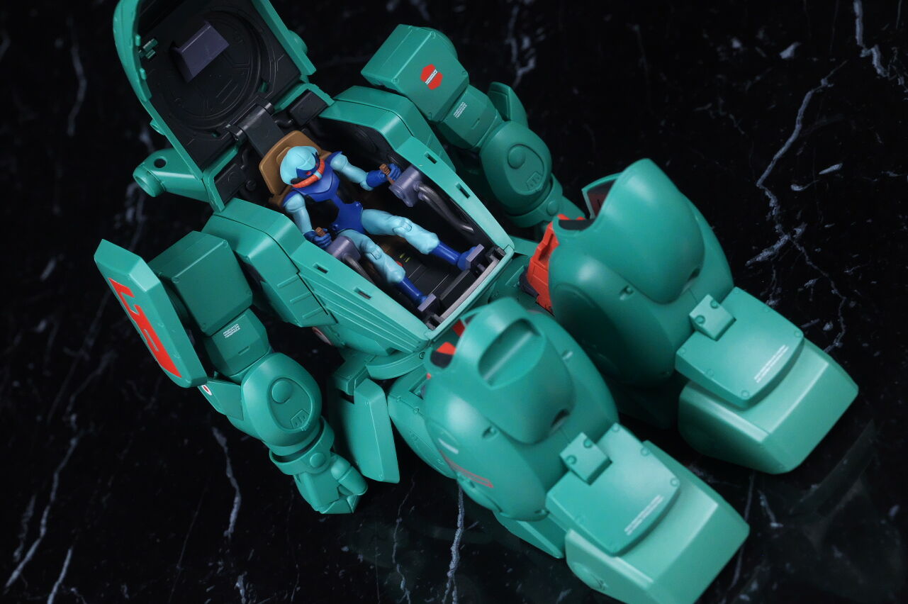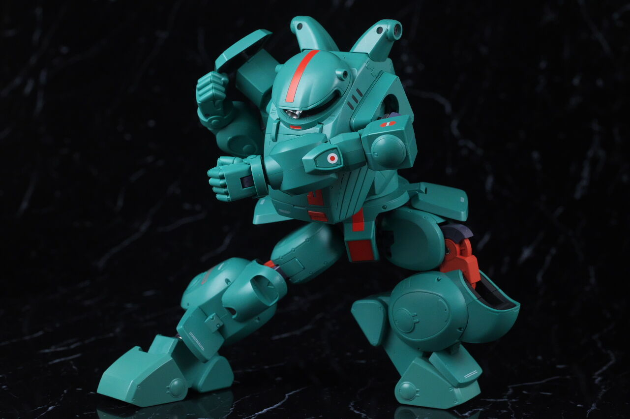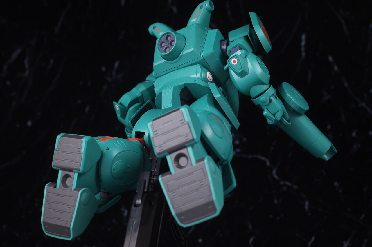 スコープドッグより一回り大きく太い体型や、エメラルドグリーンの機体色など劇中のイメージ通り再現されており、可動も武器が両手持ち出来るように、肩がスライドしたり引き出せたりなどかなり作り込まれていて、いつも通りコクピットハッチの開閉やパイロットフィギュア、降着ポーズの再現なども抜かりなく、完成度の高い出来に仕上がってました。