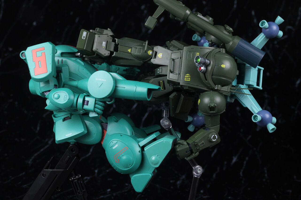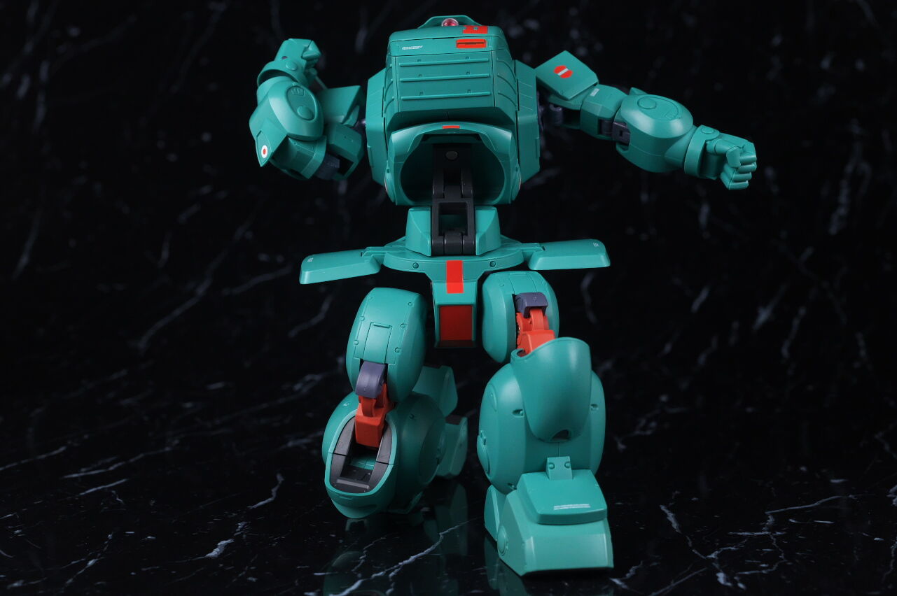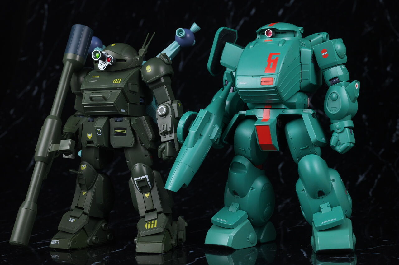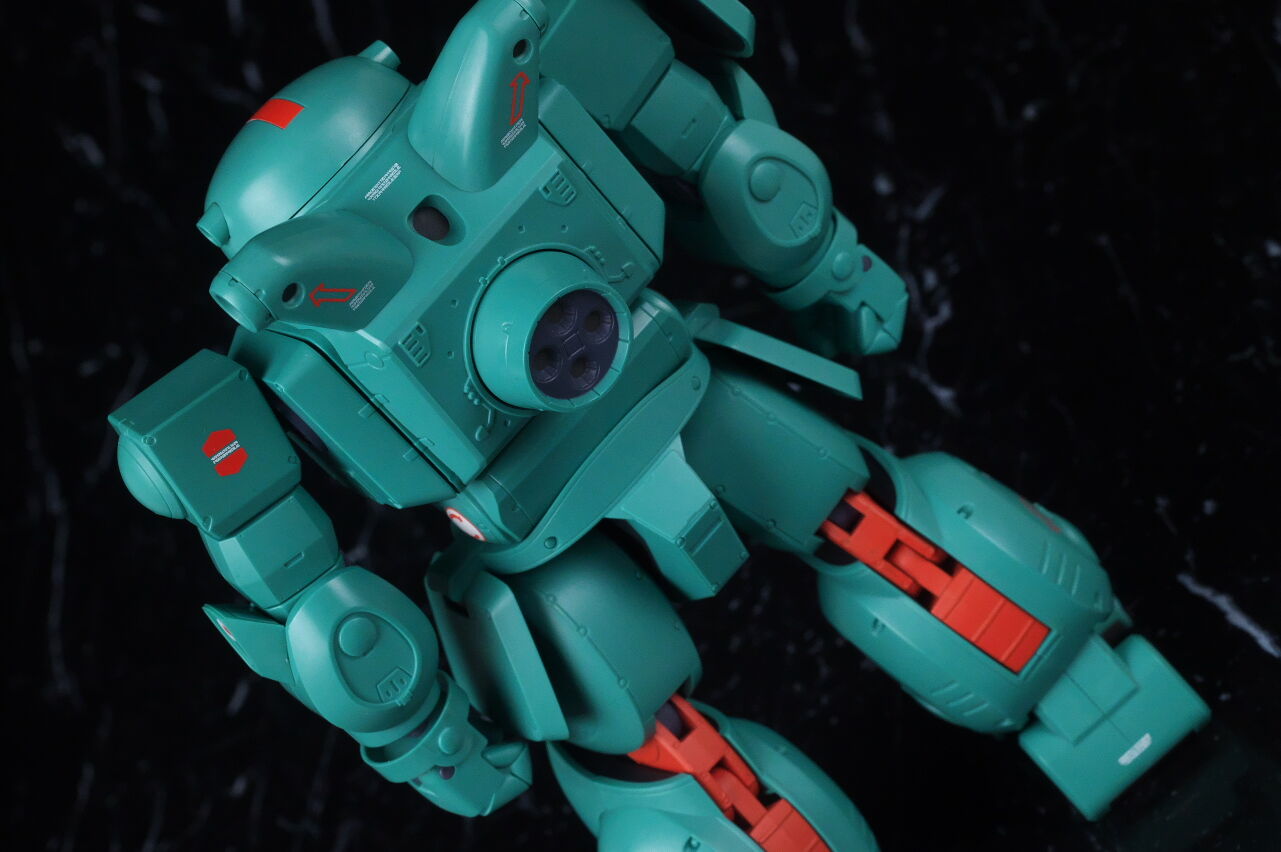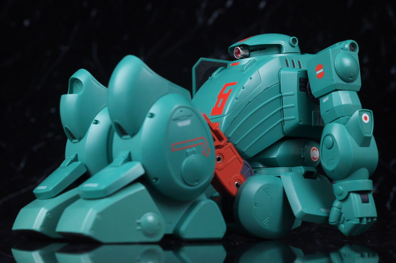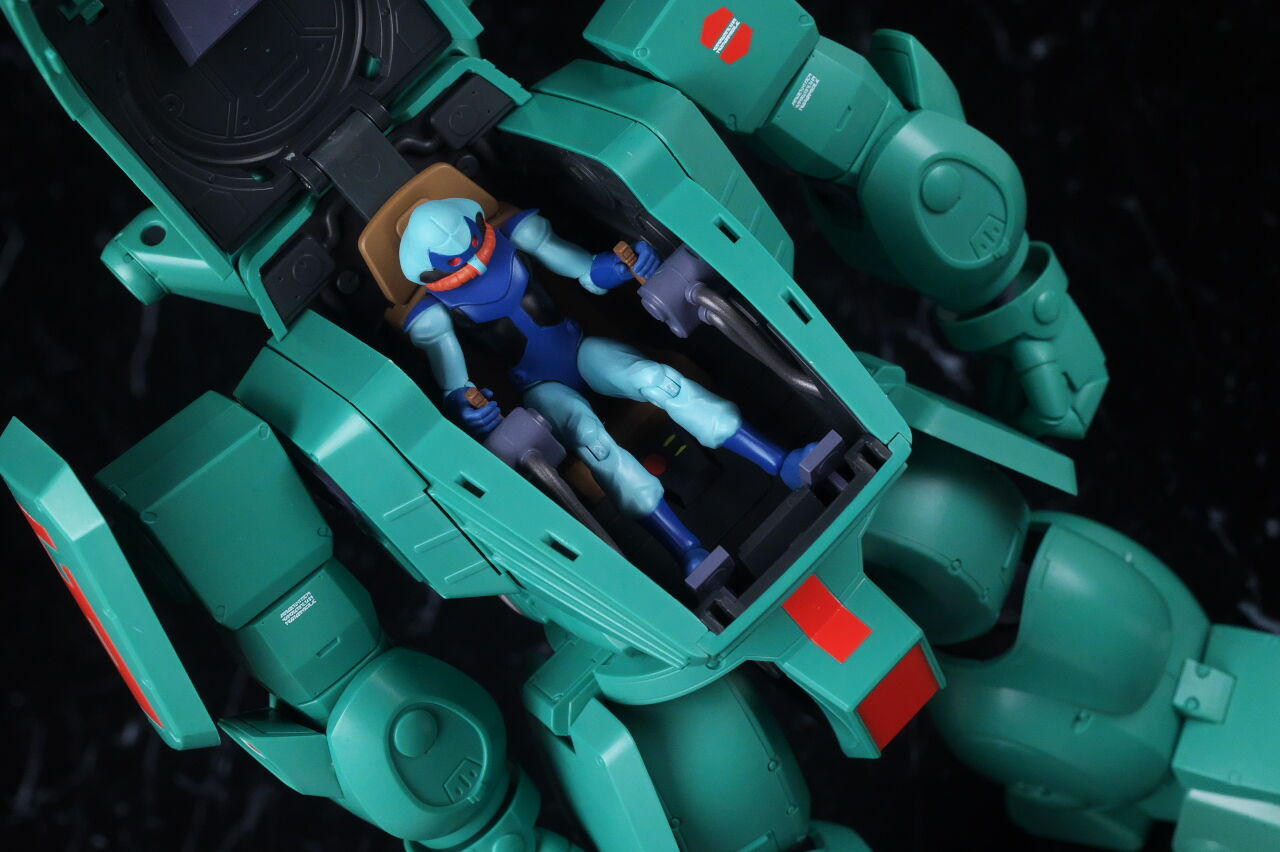 スコープドッグより一回り大きく太い体型や、エメラルドグリーンの機体色など劇中のイメージ通り再現されており、可動も武器が両手持ち出来るように、肩がスライドしたり引き出せたりなどかなり作り込まれていて、いつも通りコクピットハッチの開閉やパイロットフィギュア、降着ポーズの再現なども抜かりなく、完成度の高い出来に仕上がってました。