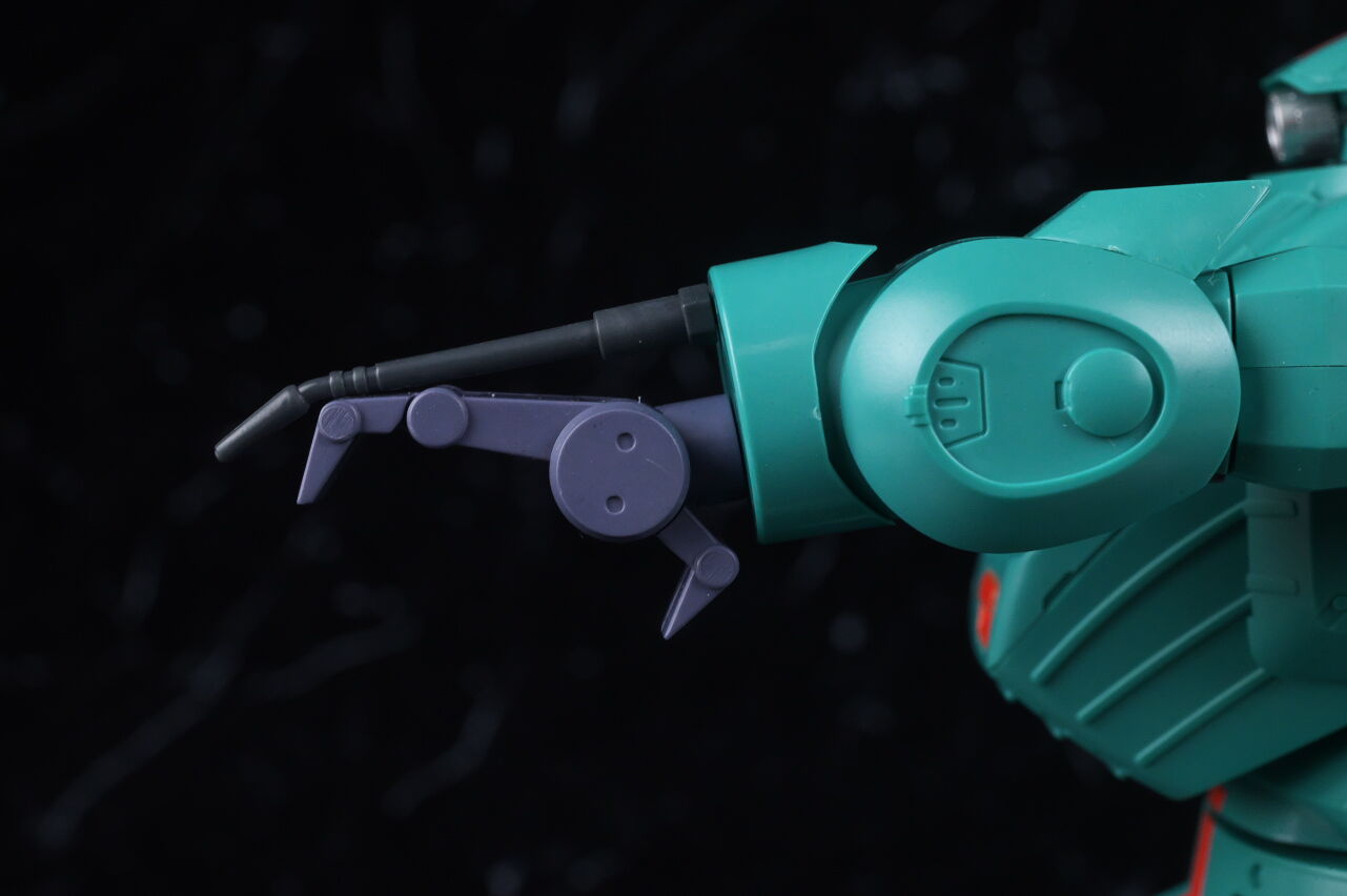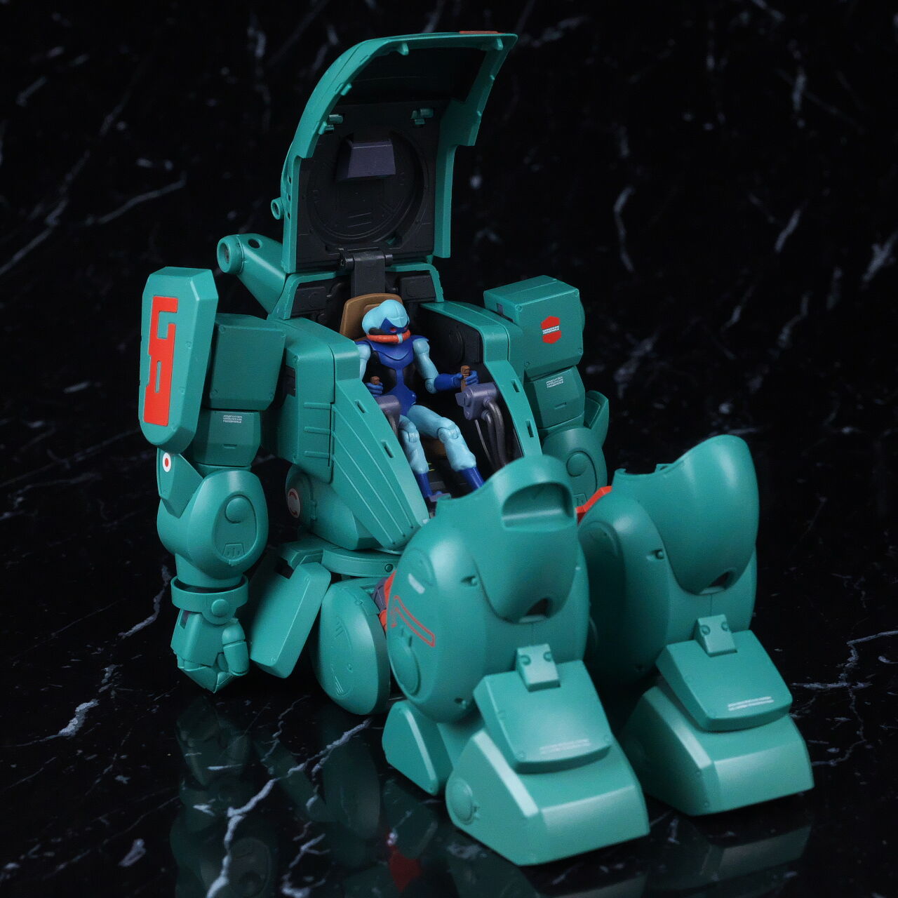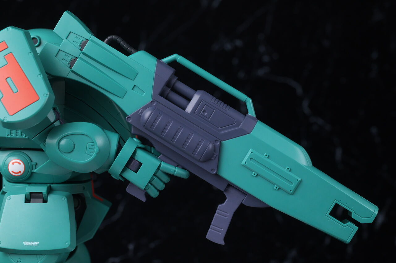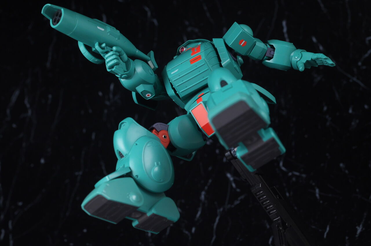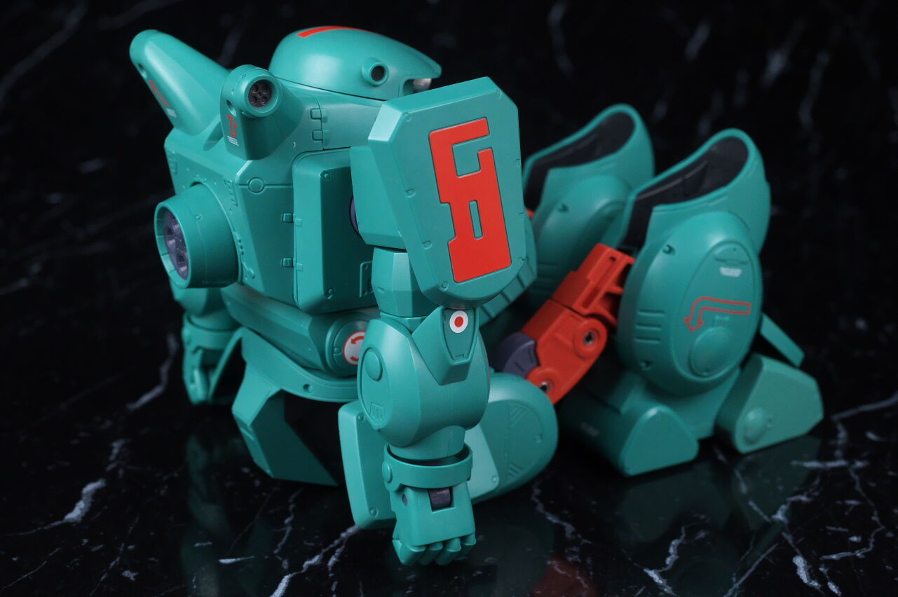 スコープドッグより一回り大きく太い体型や、エメラルドグリーンの機体色など劇中のイメージ通り再現されており、可動も武器が両手持ち出来るように、肩がスライドしたり引き出せたりなどかなり作り込まれていて、いつも通りコクピットハッチの開閉やパイロットフィギュア、降着ポーズの再現なども抜かりなく、完成度の高い出来に仕上がってました。