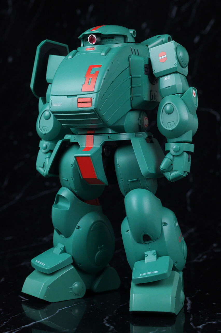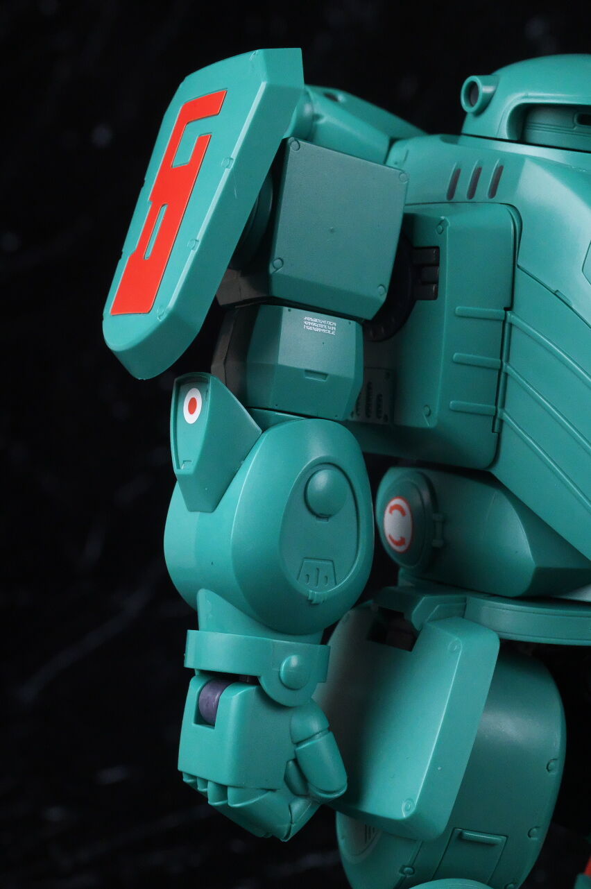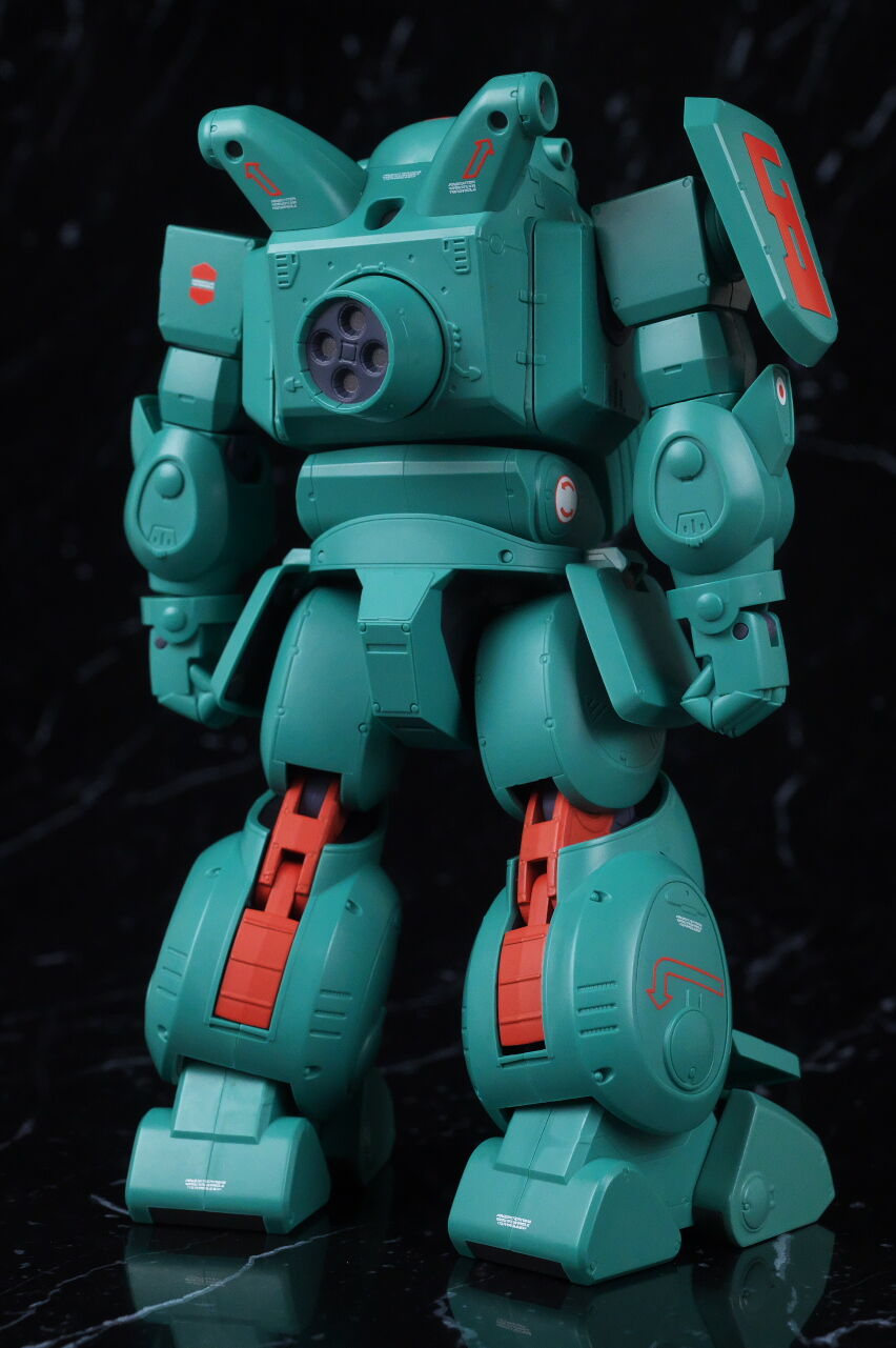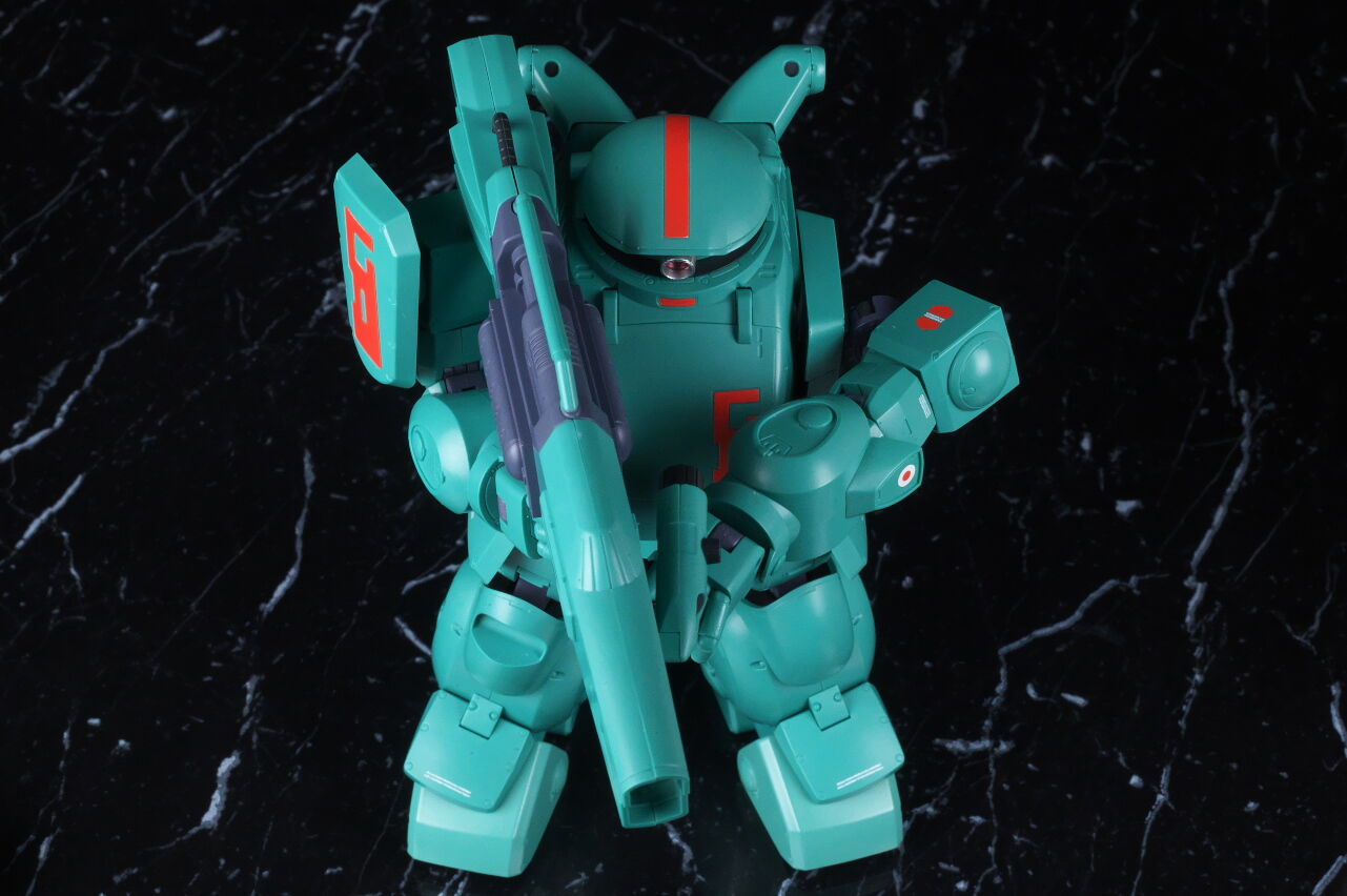 全身。名前の通りファットな体型が劇中のイメージ通り再現されており、全体的にスコープドッグより一回り大きめ。エメラルドグリーンの機体色もイメージ通り再現されてました。