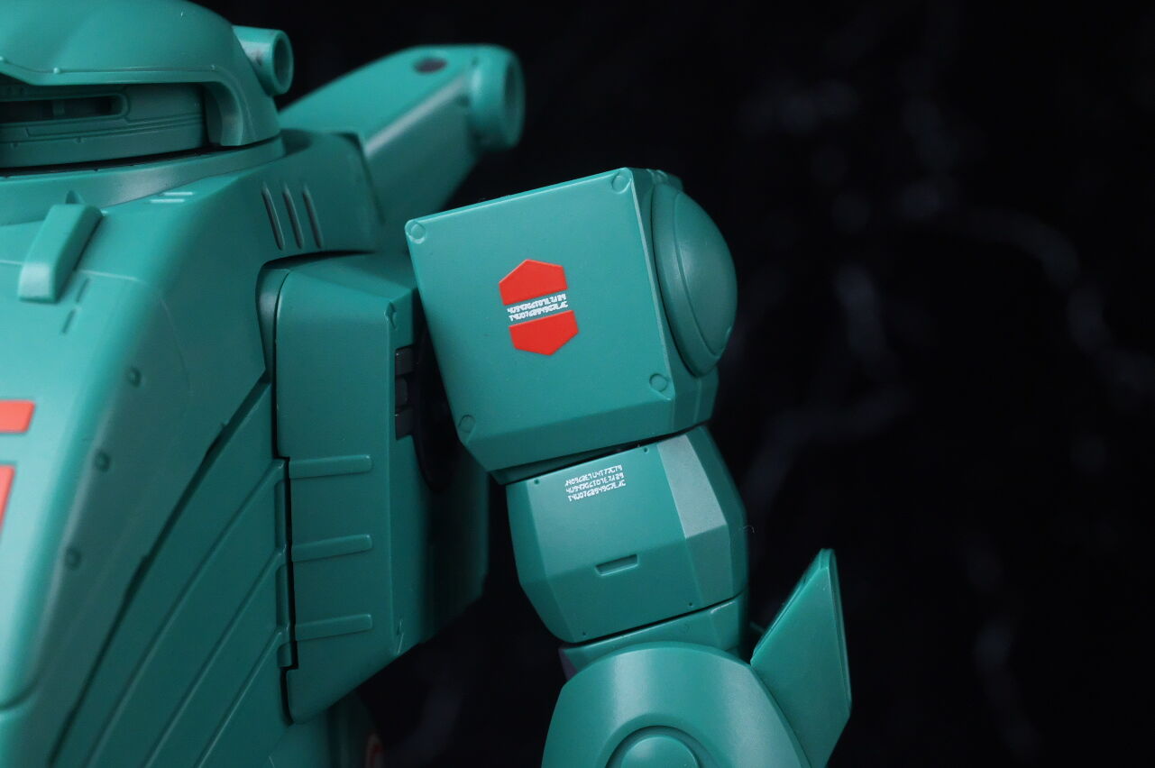 腕や足。この辺もスコープドッグより太く、曲面が多い造形に。右肩のシールドはボールジョイント可動。脚部は膝が左右非対称で、太い上にダイキャストも使われているので安定感はかなり高めでした。