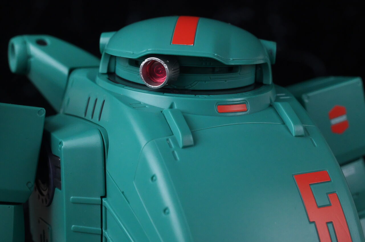 顔。スコープドッグよりシンプルな頭部デザインも劇中通りで、カメラアイはクリアパーツで再現。内側がメタリック塗装されているので光に当たるとキラリと光り、見栄えも良好。