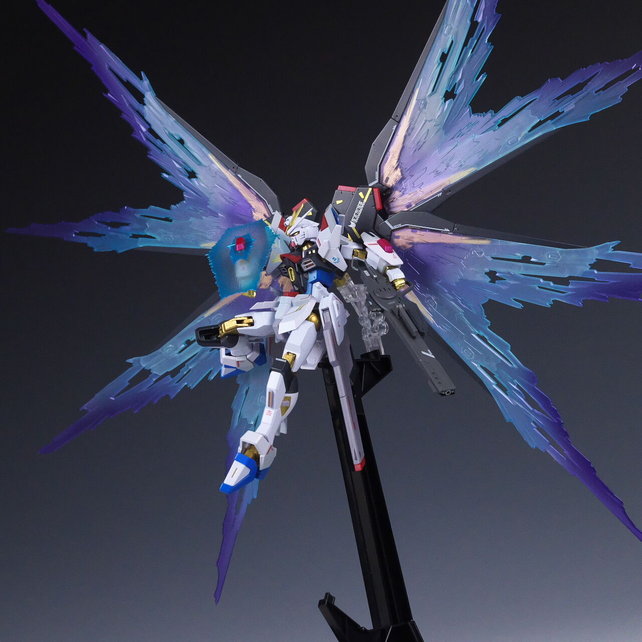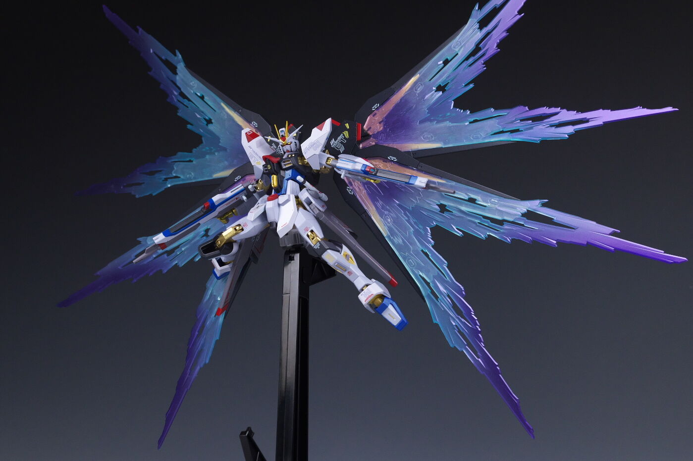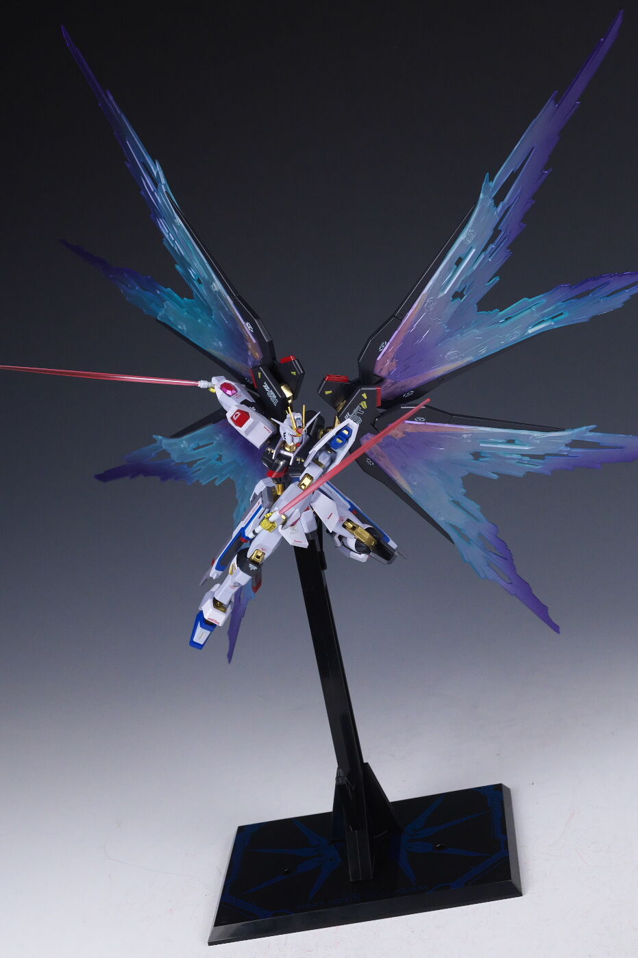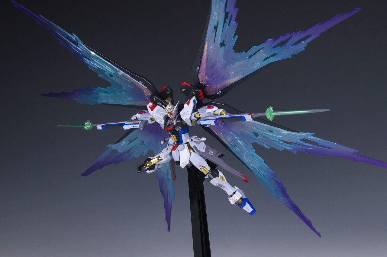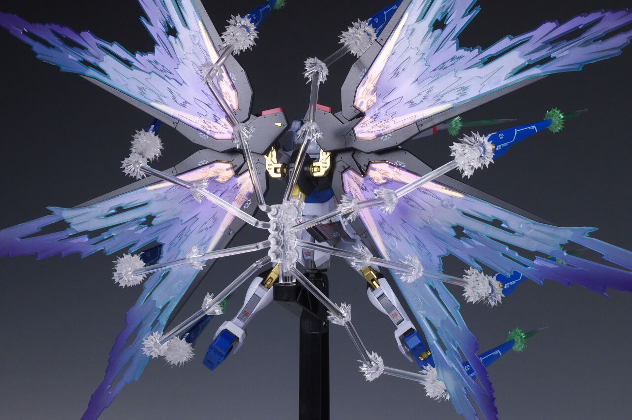 ストライクフリーダム[Re:Coordinate]を付属の支柱で浮かせて光の翼をセットした状態。