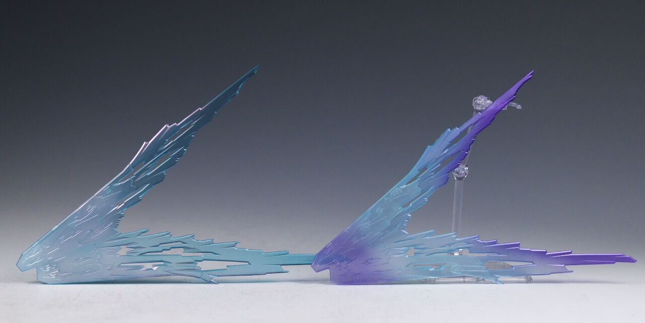 光の翼は以前と同じくクリアパーツの上から塗装されており、光の加減で色が変わる作りに。色味は結構変わっており、青の濃淡が強めになってました。