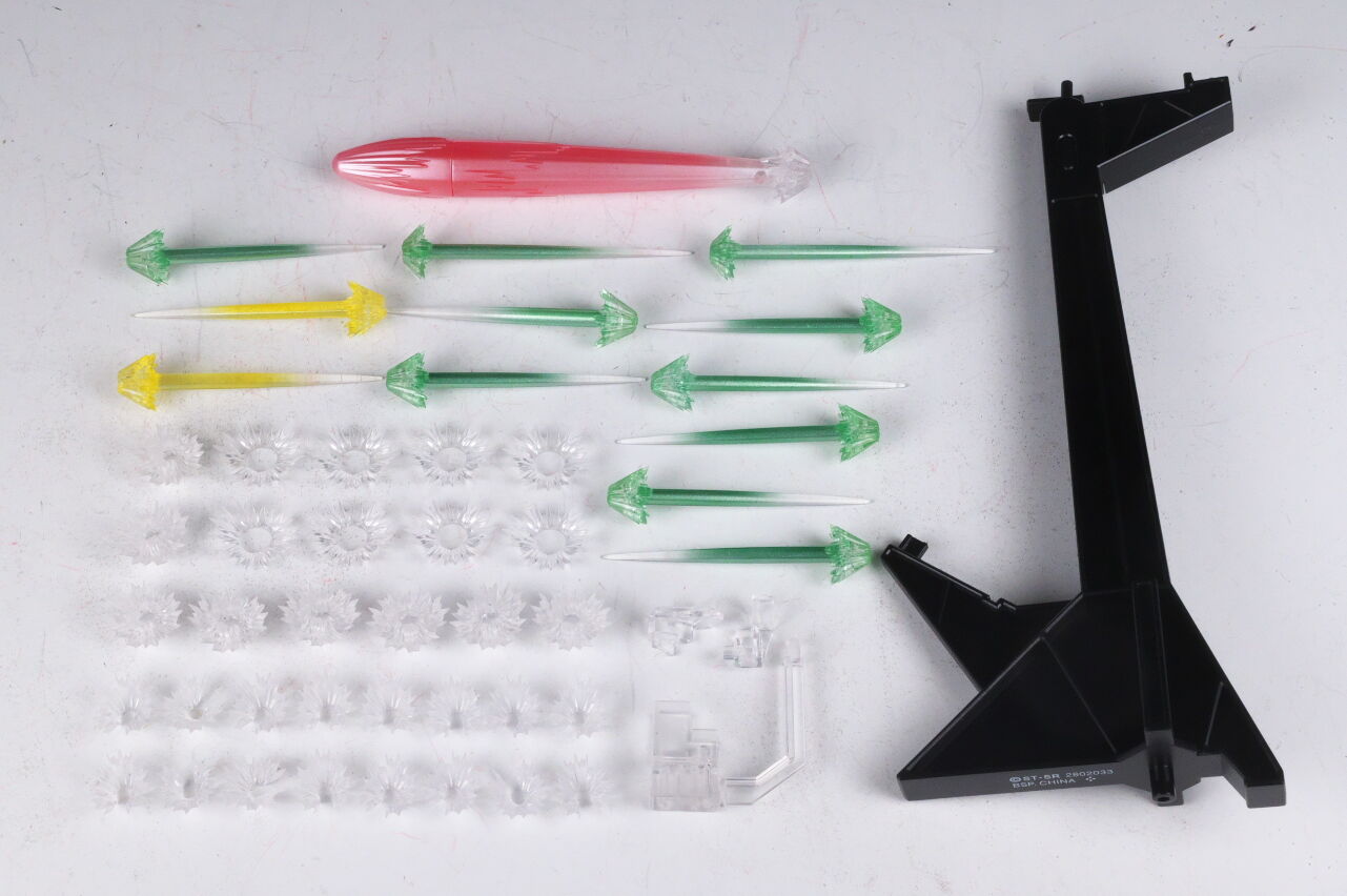 ドラグーン用エフェクトは以前同様先端に取り付けて使用。こちらは以前は無塗装のクリアパーツでしたが、今回は塗装が追加され見栄えが良くなってました。支柱に取り付けるエフェクトも、以前より透明度が増して、若干見栄えが向上。