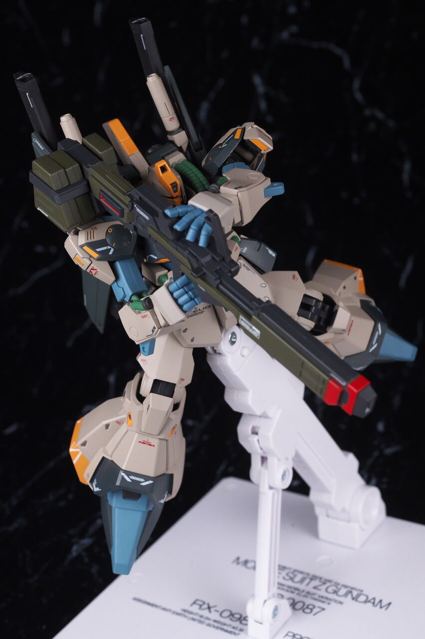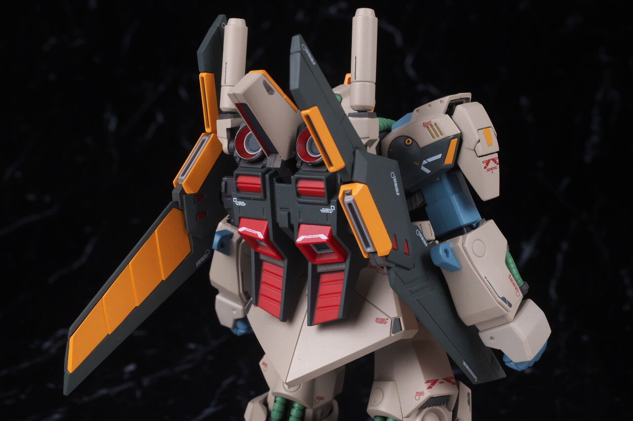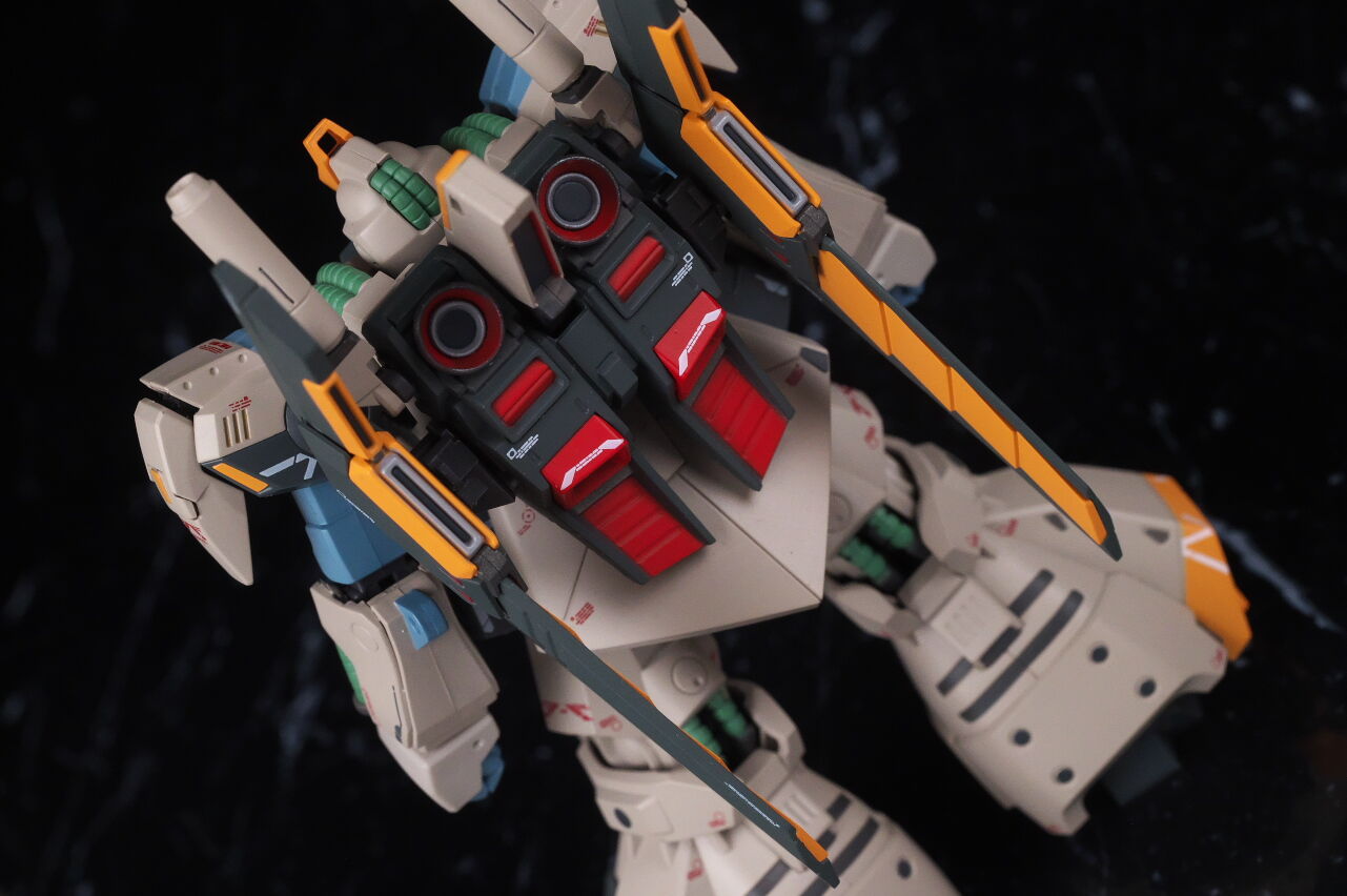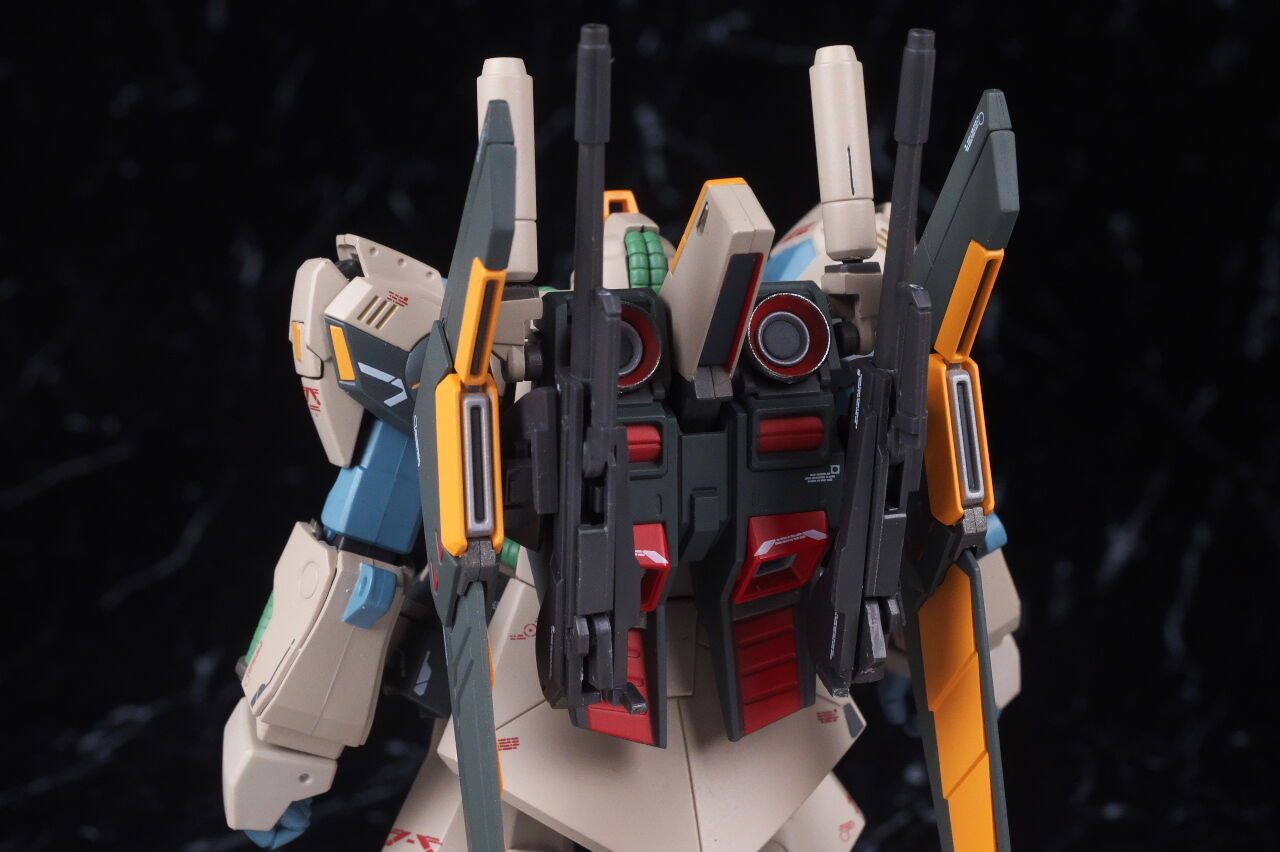 背中。バックパックのデザインもかなり違っており、上部にはZZのようなハイパービームサーベルを装備し、バインダーは百式に近い形状になってました。